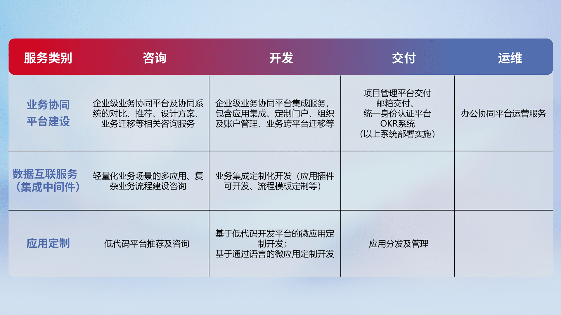 针对钉钉、、、企微、、IDaas等平台级产品提供产品的规划、、、、方案、、交付、、定制化开发等服务,,,实现如统一协同办公、、智能客户服务、、、混合会议管理、、、、智能数据查询、、、等业务场景,,,实现数字化转型。。。